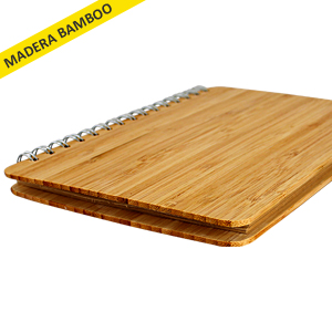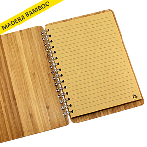 Cuaderno Ecológico con Tapas duras punta redondeada 100% de madera de Bamboo de 3mm de espesor, interior 70 hojas lineadas interiores de papel kraft reciclado de 14.3 x 20 cm y anillado metálico doble cero.