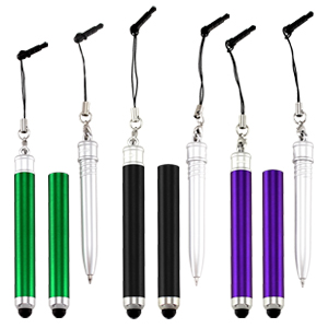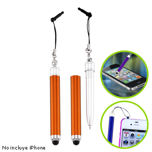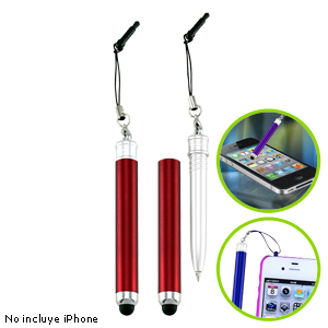 Bolígrafo “Touch-Screen” con cuerpo plateado, tapa de color metalizado y goma posterior negra para pantalla táctil. Incluye práctico soporte plástico para insertar en la salida de auricular del iPhone. Escritura azul.