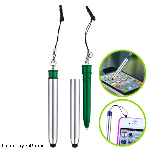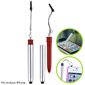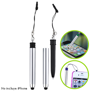 Bolígrafo “Touch-Screen” con tapa plateada y goma posterior negra para pantalla táctil. Incluye práctico soporte plástico para insertar en la salida de auricular del iPhone. Escritura azul.