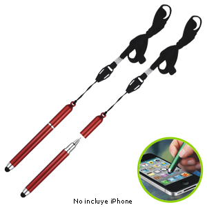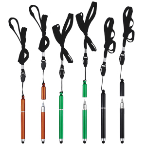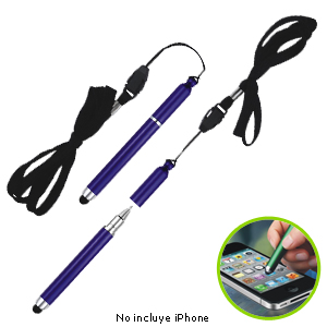 Bolígrafo “Touch-Screen” con goma posterior negra para pantalla táctil. Incluye lanyard colgante negro. Escritura azul.