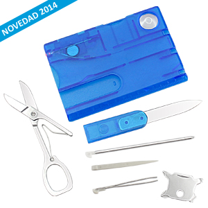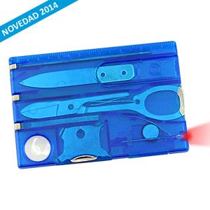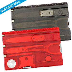 Card Tool 9 funciones con Luz Roja. Tamaño tarjeta de crédito. Incluye Bolígrafo, Mondadientes, Pinzas, Lupa, Set de Destornilladores, Tijeras, Cuchillo, Regla 7cm y Linterna con Luz Roja.