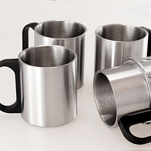 Set Torre Metálica con 4 tazas de Acero Inoxidable, con base plástica redonda negra. Presentación en caja de cartón blanco.