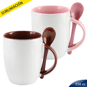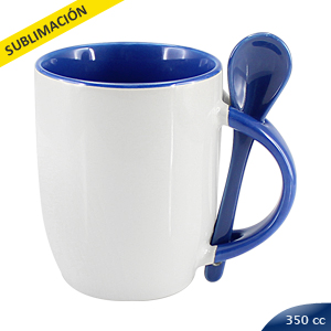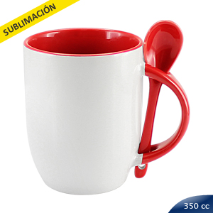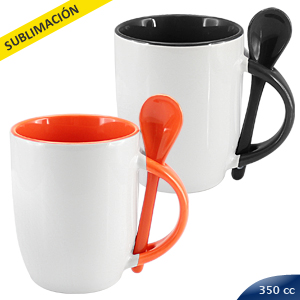 Tazón Cerámico blanco con interior, asa y cuchara de color, cobertura exterior con polímero especial marca ORCA COATINGS(R) para una sublimación de primera calidad. Cada unidad se entrega dentro de su caja individual de cartón blanco.